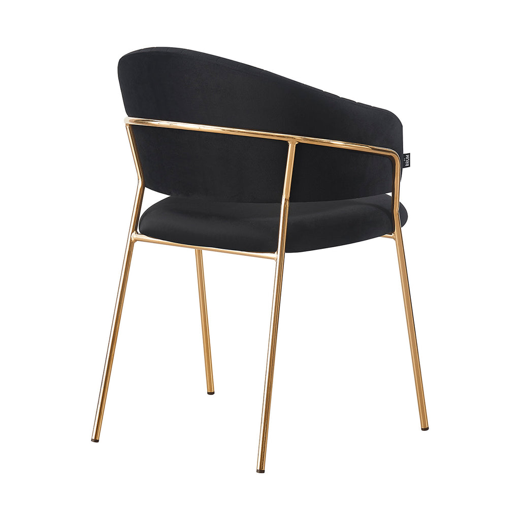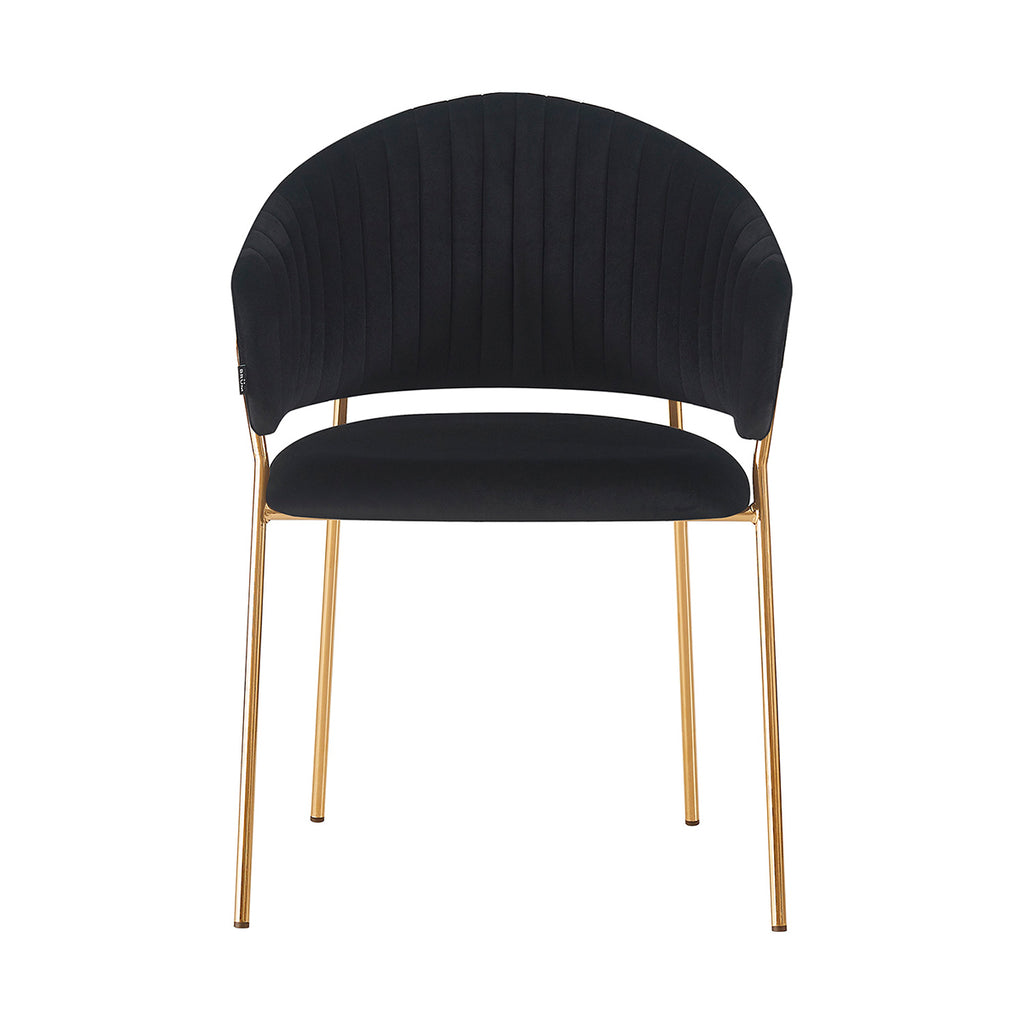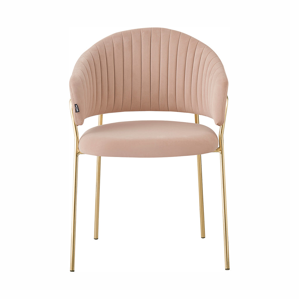 Las patas metálicas en acabado dorado aportan un toque de luz y contraste, convirtiendo a la Silla Bilbao en un punto focal dentro de cualquier comedor o rincón decorativo. La textura aterciopelada del tapizado realza la profundidad del color, generando un juego visual elegante y sutil. En conjunto, sus materiales equilibran lujo, suavidad y practicidad con una presencia ligera y refinada.