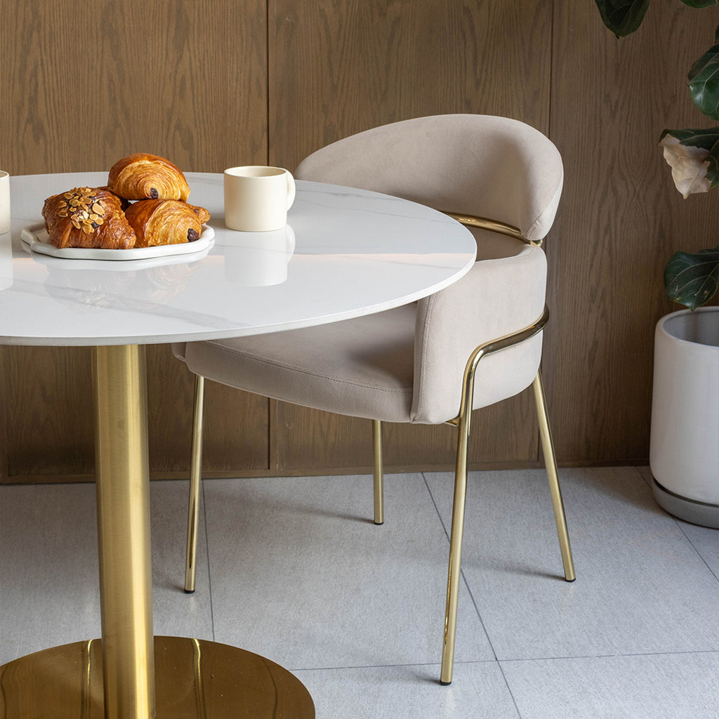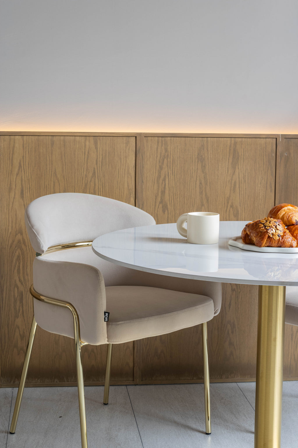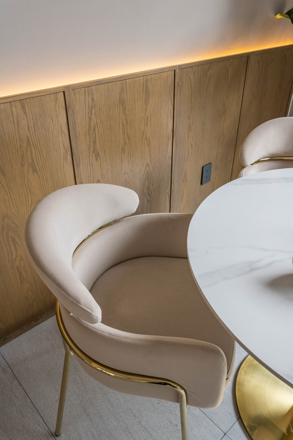 La estructura redonda crea una silueta armoniosa que equilibra lo moderno con lo atemporal, mientras que las patas en cromo dorado aportan un contraste sutil pero impactante. Ese toque metálico le da carácter y presencia, haciendo que destaque ya sea en un comedor, un estudio, o como silla de acento en cualquier rincón especial.