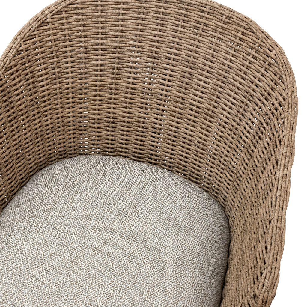 Su asiento amplio con cojín integrado aporta una sensación acogedora desde el primer contacto, mientras que su respaldo curvo genera un apoyo ergonómico ideal para largas sobremesas. Más allá de su estética, está pensada para el uso diario gracias a sus materiales resistentes, fáciles de limpiar y diseñados para conservar su apariencia con el paso del tiempo incluso en exteriores.